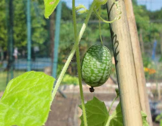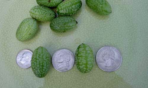 طول الثمرة 3 سم و قطرها أقل من 2 سم و هي تشبه البطيخ العادي تماما و لكن من الخارج فقط فعند قسمها الى نصفين نرى مادة لحمية خضراء مليئة بالماء و طعمها مقرمش تماما مثل الخيار.