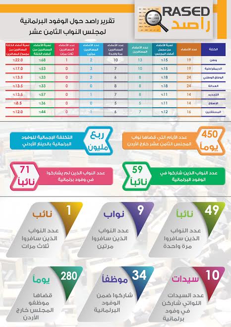 ويبين التقرير أن 59 نائباً قد سافروا ضمن 23 وفداً، فيما لم يحظى 71 نائباً بأي تمثيل في أي من الوفود النيابية المبتعثة على نفقة المجلس، وبلغ عدد النواب الذين سافروا لمرة واحد 49 نائباً، فيما سافر مرتين ما مجموعه 9 نواب بينما سافر نائب واحد ثلاث مرات، كما تَبين أن 10 سيدات من أصل 20 سيدة شاركنّ في الوفود النيابية، وفي سياق المصاريف التي قام بإنفاقها مجلس النواب على الوفود النيابية، فقد تجاوزت تكلفتها الاجمالية ربع مليون دينار أردني، وتوزعت هذه التكلفة على تذاكر سفر ومصاريف يومية للنواب والموظفين إضافة إلى سلف يتم تقديمها من قبل المجلس للموظفين أو النواب المشاركين في الوفود، وهنا يشير راصد إلى أن مجلس النواب يتلقى دعوات رسمية من جهات دولية مختلفة تكون أغلبها مدفوعة التكلفة، إلا أن مجلس النواب يقوم بدفع مياومات لأعضاء الوفد التمثيلي.