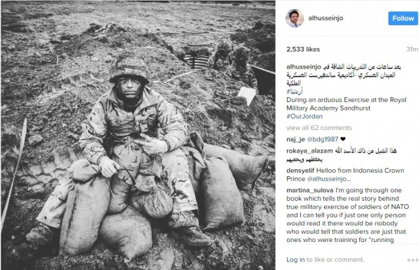 نشر ولي العهد، سمو الامير الحسين بن عبد الله الثاني في حسابه الخاص على الانستغرام صباح الثلاثاء صورة من تدريباته العسكرية.