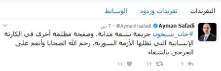 وغرد الصفدي عبر حسابه على مواقع التواصل الاجتماعي "تويتر" "جريمة بشعة مدانة، وصفحة مظلمة أخرى في الكارثة الإنسانية التي تظلها الأزمة السورية. رحم الله الضحايا وأنعم على الجرحى بالشفاء".