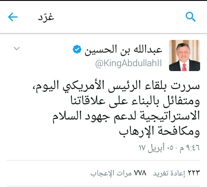 غرد الملك عبد الله الثاني، الأربعاء، على شبكة التواصل الاجتماعي "تويتر"، عقب لقاءٍ جمعه بالرئيس الأمريكي دونالد ترمب، بالعاصمة الأمريكية واشنطن.