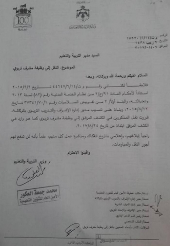 وقال مدير ادارة الموارد البشرية في الوزارة محمد الدحيات، ان المعلمين المنقولين قد خضعوا لامتحانات ومقابلات تنافسية وفقا للأسس المعلنة للوزارة، لشغل وظيفة مشرف تربوي في اللغة العربية، واللغة الانجليزية، والتربية الاسلامية، والحاسوب، والتربية الخاصة.