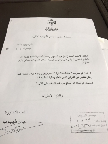 ووجهت طهبوب سؤالا إلى وزير المالية عمر ملحس، بتاريخ 8 اذار، حول تفاصيل السلفة، إلا أنها لم تصلها إجابة، من قبل الحكومة، لغاية الأن، ما دعاها إلى تحويله إلى استجواب