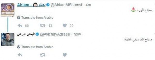 غردت احلام صباح اليوم عبر حسابها الخاص على "تويتر”، صباح الورد، لكن المفاجئ أن أول المتابعين الذي ردوا التحية كان المتحدث باسمالجيش الاسرائيلي افيخاي ادرعي الذي قال: "صباح الموسيقى الطيبة”.