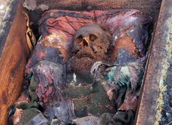 وتظهر الصور تابوتا خشبيا عليه علامات صليب روسي وبداخله الجنرال الذي تحلل جسده باستثناء شعره وشاربه ولحيته الكثيفة وتظهر ملابسه العسكرية ومعطف الضباط الكبار بالإضافة لحذائه العسكري.