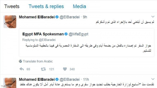ونشر البرادعي تغريدة على حسابه في تويتر، يقول فيها "تقدمت منذ 3 أسابيع لوزارة الخارجية بطلب تجديد جواز سفري وهو ما يستغرق عادة أيام".