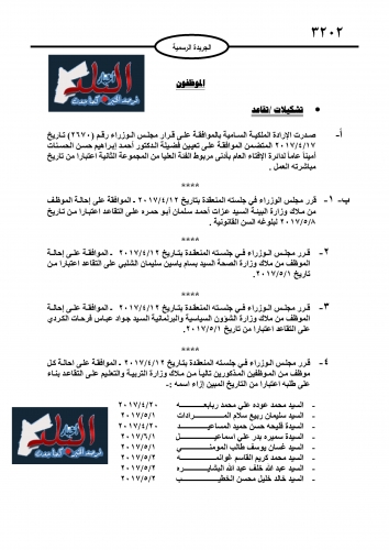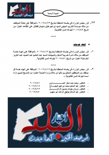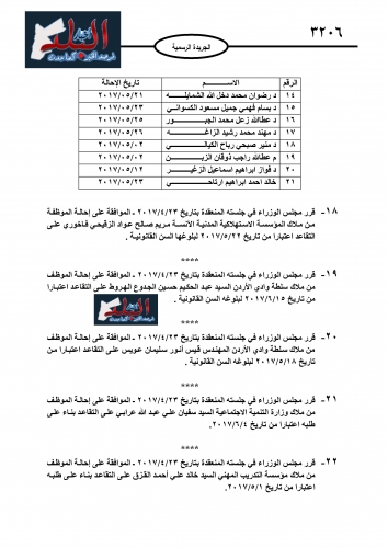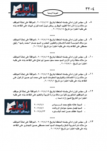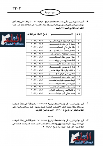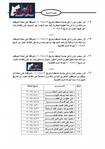 وافق مجلس الوزراء على إحالة موظفين في وزارة التربية ووزارة الصحة ومختلف الوزارات والمؤسسات الحكومية على التقاعد، اعتبارا من التاريخ المبين إزاء اسم كلّ منهم.
