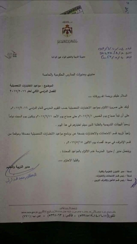 وطلبت الوزارة من مديري ومديرات المدارس تزويد قسم الامتحانات والاختبارات بنسخة من برنامج مواعيد الاختبارات التحصيلية مصدقة وموقعة من قسم الإشراف في موعد أقصاه يوم الاثنين ١٥/٥/٢٠١٧ .