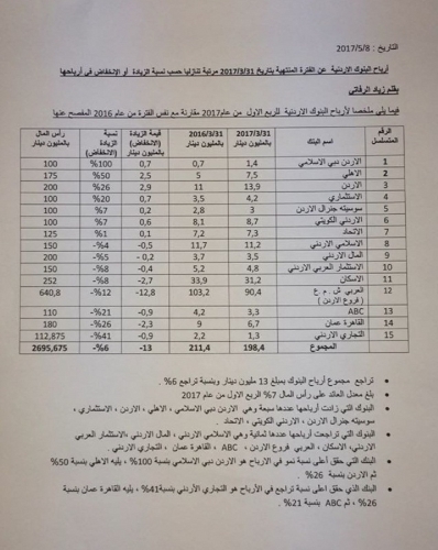 التاريخ : 8/5/2017 أرباح البنوك الاردنية عن