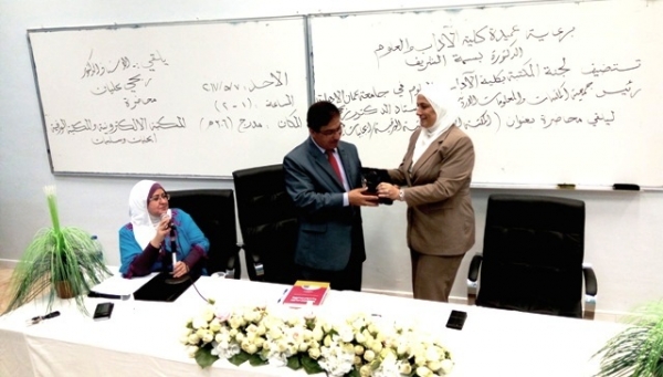 وفي نهاية المحاضرة قامت الدكتورة الشريف بتقديم درع الجامعة التكريمي للدكتور عليان.