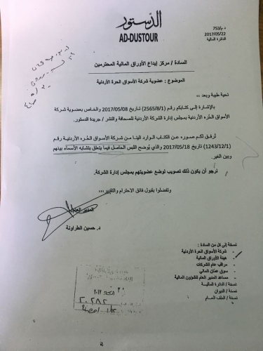 عنها صحيفة الدستور بشأن تعين مندوب لشركة الاسواق في مجلس ادارة الدستور.
