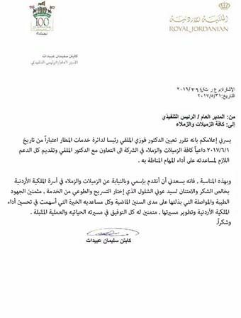 وجاء في كتاب عبيدات الموجه للعاملين بالملكية : يسرني إعلامكم بانه تقرر تعيين الدكتور فوزي الملقي رئيسا لدائرة خدمات المطار اعتبارا من تاريخ 1/6/2017 .