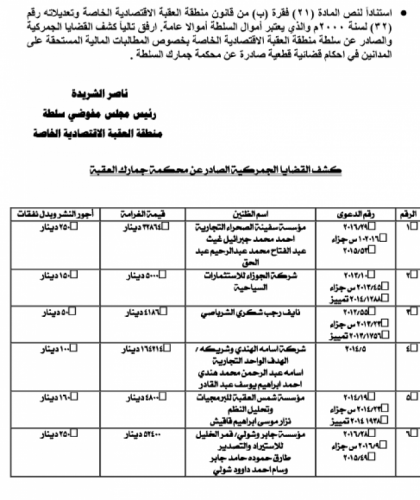 وتأتي المطالبات وفقا لنص المادة 21 فقرة (ب) من قانون منطقة العقبة الاقتصادية الخاصة وتعديلاته رقم 32 لسنة 2000.