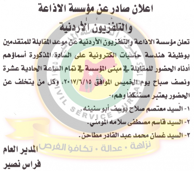 أخبار البلد - أخبار البلد - دعا ديوان الخدمة المدنية بالتعاون مع مختلف الوزارات والمؤسسات الحكومية، التالية اسماؤهم لاجراء المقابلات الشخصية وعقد الامتحان التنافسي لغايات التعيين.