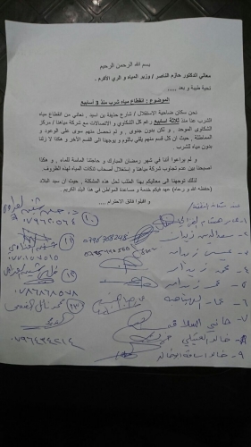 وأضاف المواطن ، أن سكان المنطقة "المرهقين" جراء انقطاع المياه لفترة طويلة عن الضاحية وقعوا عريضة لتقديمها لوزارة المياة والري والأجهزة المعنية في سلطة المياه ، لافتا الى أن المياه تصل الى المنازل بشكل متقطع منذ فترة طويلة، رغم الشكاوى العديدة ، والكثيرة ،التي لم تلق أي حلول أو اهتمام .