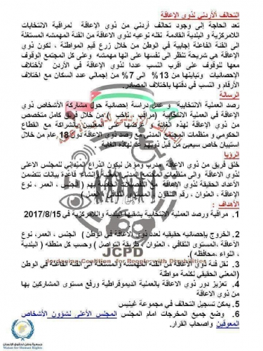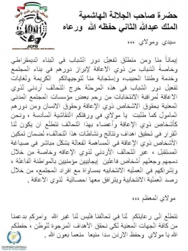 اصحاب ذوي الاحتياجات الخاصه رفعوا شكوى الى الديوان الملكي العامر معبرين عن استياءهم لما يتعرضون له من سوء بالمعامله والتهميش المستمر لدورهم من قبل مؤسسات الدوله المعنيه وهي لا تشكك بالرعايه الملكيه لهم وانهم على ثقه بأنها ستنفذ بالرغم من وجود من يعيق تنفيذ الرؤيا الملكيه