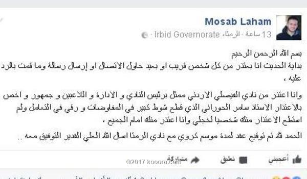 تقدم النجم الدولي مصعب اللحام، باعتذاره لإدارة النادي الفيصلي، بعد توقيعه لناديه الأم فريق الرمثا حيث سيمثله في الموسم المقبل.