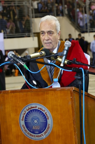حيث قال في كلمته التي القاها في بداية الحفل : أننا ونحن ندفع بهذه الكوكبة من الخريجين نحو ميادين العمل والعطاء لنسجل بإعتزاز كبير مسيرة جامعة العلوم التطبيقية الخيرة في خدمة الوطن والامة، موضحا الى ان الطلبة الخريجون وأولياء أمورهم يعتزون بحمل شهادات هذه الجامعة شأنهم شأن خريجي الأفواج السابقة، خريجي الجامعة الأولى في الوطن العربي التي تحمل شهادة الآيزو في التعليم العالي والبحث العلمي منذ عام 2003 وللآن.
