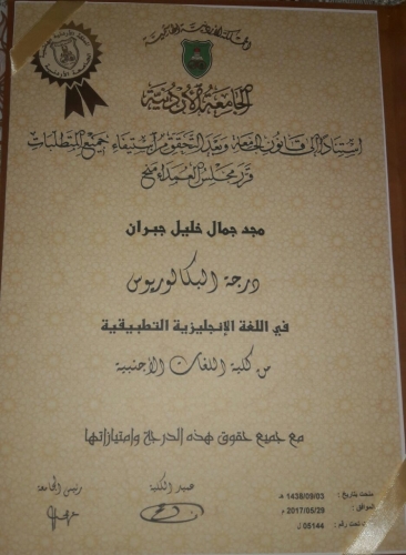 بعد سعي مع الجد والاجتهاد ، حصلت مجد جمال جبران على شهادة اللغة