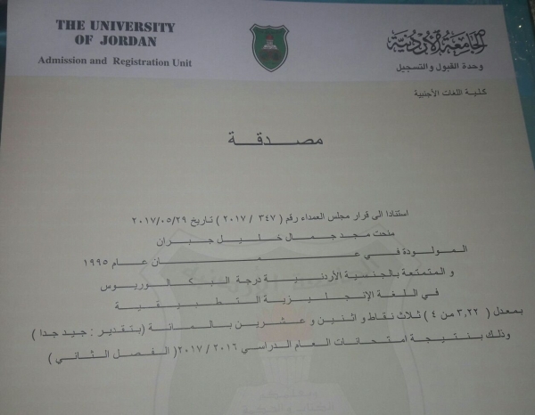 الإنجليزية التطبيقة من الجامعة الأردنية ، بتقدير "جيد جدا".