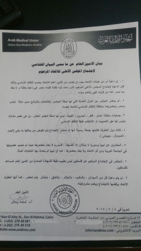 "أخبار البلد"، تواصلت مع الأمين العام المساعد ورئيس لجنة التشريعات في الإتحاد الدكتور اليمني عبد القوي الشميري للوقوف على حيثيات وتفاصيل الإجتماع الذي يخالف أنظمة الاتحاد والتي تعتبر أن أعضاء الاتحاد ومن يمثل الدول المشاركة في الاجتماعات هم النقابات ومن يرأسها من نقباء منتًخًبين والمنضوي تحت مظلته الأطباء .