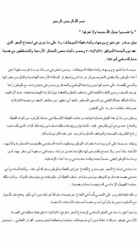 وبينت في بيان وصل "أخبار البلد" ، أنها حريصة على سلامة وامن واستقرار الأردن ومنظمة أمنه المجتمعي وأضاف البيان " المؤسسة العسكرية والأجهزة الأمنية خط أحمر لا يسمح بالتعرض لها بالإساءة فنحن شركاء حميعنا في مجابهة أي خطر يهدد أمن وسلامة ، لتبقى حصنا منيعا وقلعة شامخة في وجه أعداء الإنسانية".
