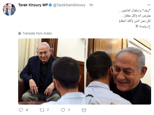وعلق خوري على استقبال رئيس الوزراء الإسرائيلي بنيامين نتنياهو للمجرم بالأحضان وقال: "زيف" واستقبال الفاتحين... يفترض أنه أكل مفك ... (لكن نحن الذين أكلنا الجك) ع رؤوسنا!