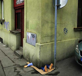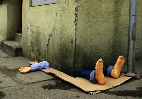 العمل الفني هو من تصميم الفنان الإيطالي فرا بيانكوشوك، المشهور بأعماله الجامحة ومنحوتاته الغريبة، حيث خرج هذه المرة بفكرة طريفة ومرعبة في الوقت نفسه، لجسد رجل ممدد على لوح كرتوني أسفل مبنى، أثارت فزع الناس الذين شاهدوها للوهلة الأولى.