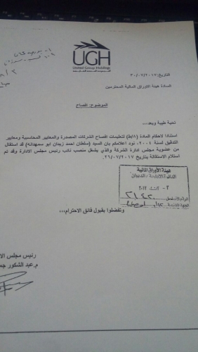 وبين في كتاب تم إرساله إلى هيئة الأوراق المالية، وصل "أخبار البلد،أنه تم استلام استقالة "أبو سمهدانة" بتاريخ 26/7/2017 ،وتم بموجبه "الإفصاح" استنادا لأحكام المادة (8/ط) لتعليمات إفصاح الشركات المصدرة والمعايير المحاسبية ومعايير التدقيق لسنة 2004.