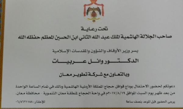 وجاء في نص الدعوة: "يتشرف وزير الاوقاف والشؤون والمقدسات الاسلامية الدكتور وائل عربيات بدعوتكم لحضور حفل توديع قوافل حجاج المملكة الاردنية الهاشمية، وذلك في تمام الساعة الواحد من بعد ظهر يوم السبت الموافق 19/ 8 / 2017 في واحة الحجاج التابعة لمنطقة معان التنموية في محافظة معان".
