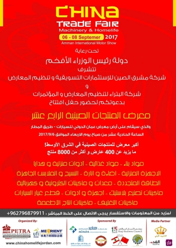 اخبار البلد- تنظم شركة البتراء للمعارض والمؤتمرات بالتعاون مع شركة مشرق الصين للاستثمارات التسويقية معرضاً مخصصاً للمنتجات الصينية وذلك تحت رعاية دولة رئيس الوزراء الدكتور هاني الملقي.