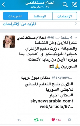 الروائية العربية الجزائرية الكبيرة أحلام مستغانمي في تغريدة تويتريه تشكر الأردن على ما يقدمه للأشقاء اللاجئين السوريين.