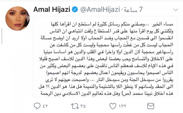 مساء الخير ...وصلني منكم رسائل كثيرة لم استطع ان اقرأها كلها ولكنني كل يوم اقرأ منها على قدر المستطاع ولفت انتباهي ان الناس انقسموا الى قسمين مع الحجاب وضد الححاب اولا اريد ان اوضح مسألة الحجاب ليست كل من غطّت رأسها محجبة وليست كل من كشفت عن رأسهاغير محجبة لان الدين اولا وآخرا في القلب والدين هو اساسآ مبنيا على الاخلاق والتسامح وحب بعضنا لبعض وهذا الدين للاسف اصبح قليلا في هذه الايام للاسف فمعظم الناس ناقمين على بعضهم البعض وكثير من الناس اصبحوا يحاسبون ويقيمون اعمال بعضهم لدرجة انهم اصبحوا يقرروا من سيدخل الجنة ومن سيدخل النار ... واصبحت عيونهم لا ترى الى الحقد ولسانهم لا ينطق اللا بالشتيمة والنميمة هل هذا هو الدين ؟؟ هل هذه اخلاق نبينا محمد (ص) وهل هذه تعاليم الدين الاسلامي دين الرحمة والحب والتسامح !!وهل هذه الصورة التي يجب ان نعطيها عن الاسلام كل انسان يعطي طباعا عن دينه من خلال تعاطيه مع الآخر ومن خلال تعليقاته من اي دينٍ كان ..بالنسبة لموضوع الححاب اذا كان واجبا علينا في القرآن ام لا هذه مسألة راحة يشعر بها الانسان ام لا... وانا فخورة بهذا القرار ومقتنعة به ليس تعصبا ابدا لانني بعيدة كل البعد عن التعصب الديني والطائفي واحترم الاديان كلها واعامل الاشخاص على اخلاقهم وعلى انسانيتهم وليس على دينهم ولكن الحجاب شيء جميل جدا للمرأة بنظري في كل الاديان فالسيدة مريم عليها السلام والقديسات دائما نصورهم في زي الحجاب فانا برأي انه وقار وجمال للمرأة واكرر قولي ان هذه مسألة شخصية لكل امرأة وفي النهاية الحجاب يجب ان يكون داخليا قبل ان يكون خارجيا مع حبي وتقديري #امل _حجازي #الدين_اخلاق