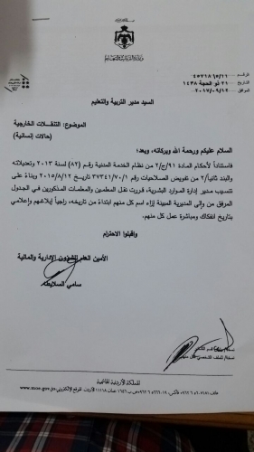 أخبار البلد – علمت "أخبار البلد" أن وزارة التربية والتعليم قررت نقل المعلمين والمعلمات من فئة الحالات الإنسانية ،على ضوء تنسيب مدير إدارة الموارد البشرية ،وذلك استنادا لأحكام المادة 91/ج/2 من نظام الخدمة المدنية رقم (82)لسنة 2013 وتعديلاته،والبند ثانيا من تفويض لاصلاحيات رقم 1/70/37341تاريخ 12/8/2015.