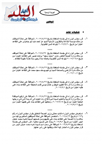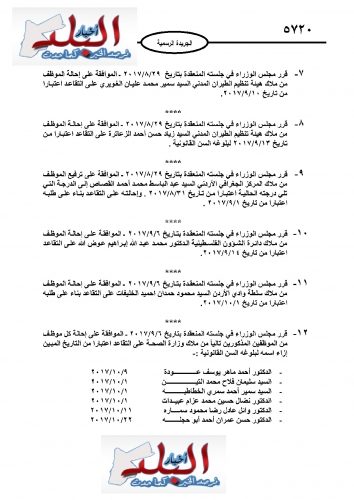 قرر مجلس الوزراء إحالة موظفين في التلفزيون ودائرة الاحصاءات العامة ووزارة الصحة ووزارة البيئة ودائرة العطاءات الحكومية ووزارة الزراعة ووزارة التربية والتعليم الى التقاعد.
