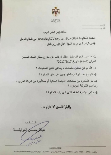 وطالب النائب العوايشة وزير النقل بالاجابة عن هذه الأسئلة وذلك استنادا لأحكام المادة 96 من الدستور وعملا بأحكام المادة 125 من النظام الداخلي لمجلس النواب .