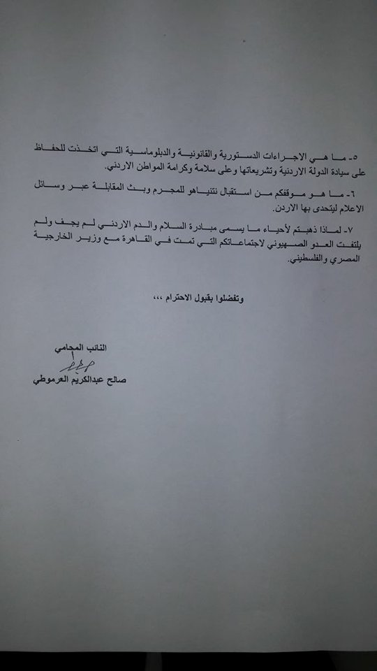 كما طلب العرموطي تزويده باسم المجرم الصهيوني الذي قام بقتل المواطنين "محمد زكريا الجواودة، والطبيب بشار الحمارنة"، وتحديد فيما إذا كانت الأردن قد اطلعت على سيرته الذاتية قبل دخوله الأردن، وتزويده بوقائع المؤتمر الصحفي الذي تم عقده وزير الخارجية لهذه الغاية.