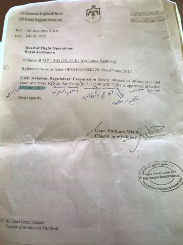 ما أسباب قيام هيئة تنظيم الطيران المدني بالموافقة على استخدام وتشغيل طائرة مستأجرة من قبل الملكية الأردنية لنقل الركاب بتاريخ 17/6/2017 قبل استكمال إجراءات الموافقة الرسمية من قبل الدوائر والجهات المختصة بالهيئة ،وقبل التأكد من شرعية العق وملحقاته والذي أبرم بتاريخ 22/6/2017،حيث شكلت هذه الموافقة خطرا على سلامة الركاب والطائرة ،وعرضت الشركة المخاطر الإفلاس في حال وقع حادث لهذه الطائرة حيث أن شركات التأمين لا تكون ملزمة بالتعويض بسبب ما قام به رئيس الهيئة من تجاوز.