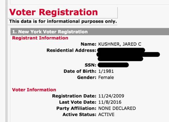 ومن خلال الوثيقة يتضح أن كوشنر سجل في قوائم الناخبين في عام 2009، وآخر مرة شارك في التصويت كان في عام 2016.