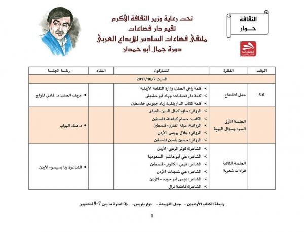 أطلقت دار فضاءات للنشر " ملتقى فضاءات للإبداع العربي" الدورة السادسة " دورة الكاتب جمال أبو حمدان. تحت شعار " الثقافة حوار"، والذي يبدأ فعالياته الساعة الخامسة من يوم السبت الموافق7/ وحتى يوم الاثنين9/10 في رابطة الكتاب الأردنيين –جبل اللويبدة دوار باريس.
