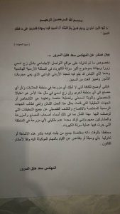 فإنني أوضح للكافة أنني لا أملك أي مزرعة في منطقة الحلابات و/ أو أي مصنع في أي منطقة أخرى وإن زج اسمي في مثل هذا الأمر هو اغتيالاً لشخصيتي وتلويثاً لسمعتي وتضليلاً متعمداً وتعتيماً عن الأشخاص أو الجهات الحقيقية التي قامت بمثل هذا العمل الشائن وإنني أطالب الجهات الرسمية المختصة بالافصاح والكشف التفصيلي عن جميع التحقيقات التي توصلت اليها بهذا الشأن بما في ذلك أسماء أصحاب المصنع والمزرعة المشاركين معهم، وإنني أؤكد مجدداً عدم ملكيتي لأي مزرعة في المنطقة التي جرت فيها عملية سرقة الكهرباء.