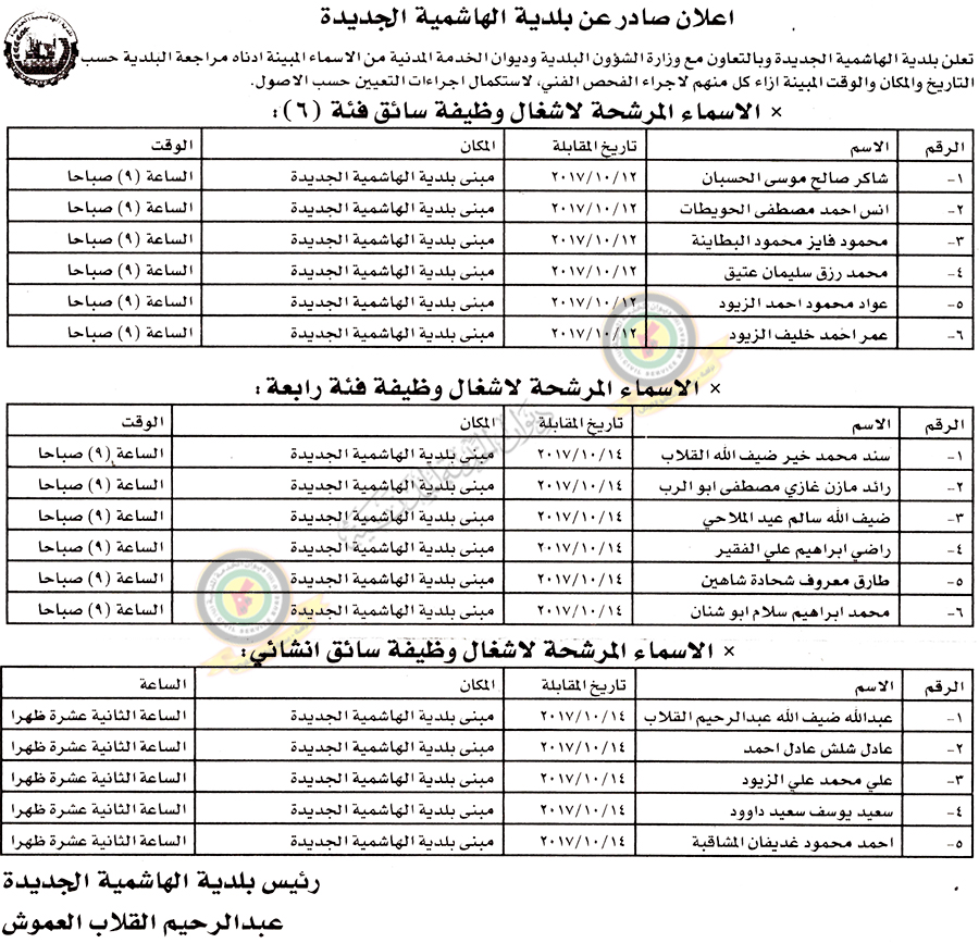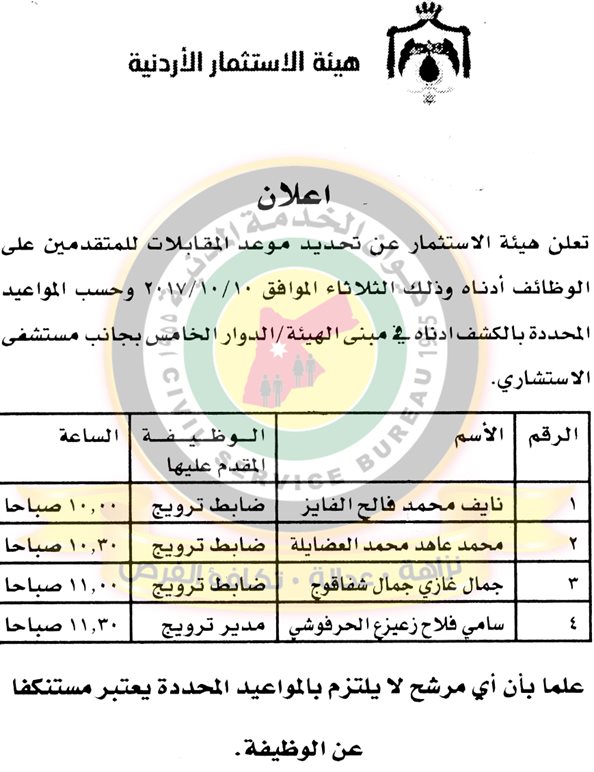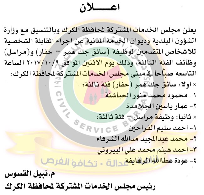 دعا ديوان الخدمة المدنية بالتعاون مع مختلف الوزارات والمؤسسات الحكومية، التالية اسماؤهم لاجراء المقابلات الشخصية لغايات التعيين.