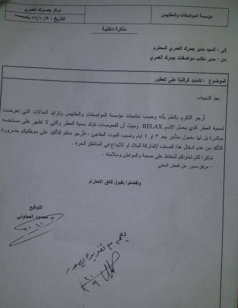 وعمم العجلوني في مذكرة داخلية حملت عنوان "تشديد الرقابة على العطور" على العاملين في جمرك العمري (على الحدود بين الأردن والسعودية) بضرورة التأكيد على الموظفين بعدم دخول هذا الصنف الى البلاد والمنطقة الحرة.