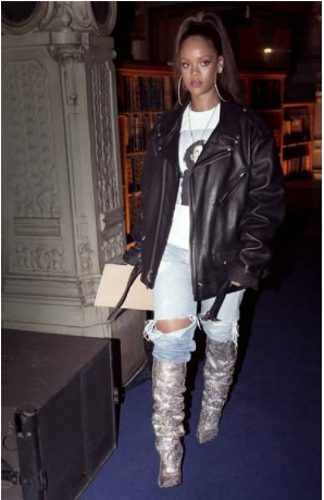 أبرزها تلك الي تألقت بها أخيراً هيفاء وهبي في حفل غنائي مميز أحيته في القاهرة، وكنا قد شهدنا النجمتين العالميتين سيلين ديون وريهانا تتألقان بها في إطلالتهن اليومية مع الدنيم والجاكيتات بالأسلوب الحربي الـbomber jacket، بحيث كسرتا بهذه الجزمة، التي يبلغ سعرها $10,000 قواعد الإطلالات الكاجويل واليومية من خلال جعلها براقةً أكثر.