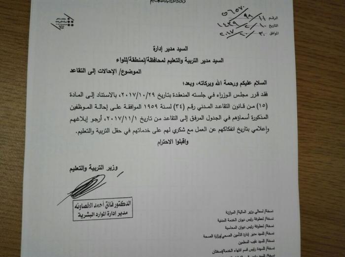 وافق مجلس الوزراء بناء على تنسيب من وزير التعليم عمر الرزاز على احالة عدد من الموظفين للتقاعد .