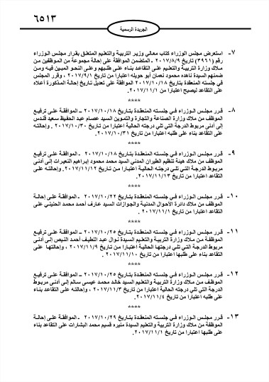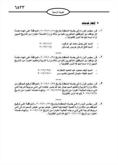 وافق مجلس الوزراء على إحالة موظفين في وزارة التربية ووزارة الصحة ومختلف الوزارات والمؤسسات الحكومية على التقاعد، اعتبارا من التاريخ المبين إزاء اسم كلّ منهم.