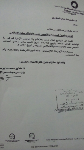 إشارة إلى الموضوع أعلاه نرجو إعلامكم بأن مجلس الإدارة قد قرر في اجتماعه العاشر المنعقد بتاريخ 4/11/2-17/تعيين اغلسيد سامر سعدي الصاحب التميمي مدير عام لبنك صفوة الإسلامي اعتبارا من تااريخ 1/3/2018.