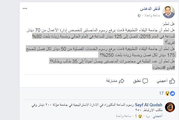 هل تعلم أن جامعة البلقاء التطبيقية قامت برفع رسوم الماجستير