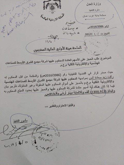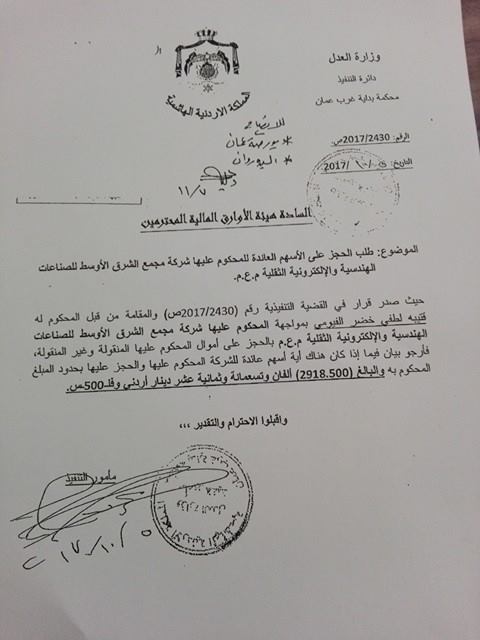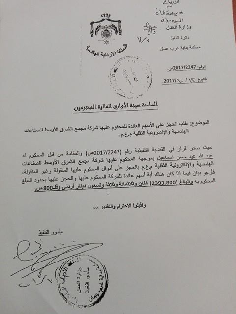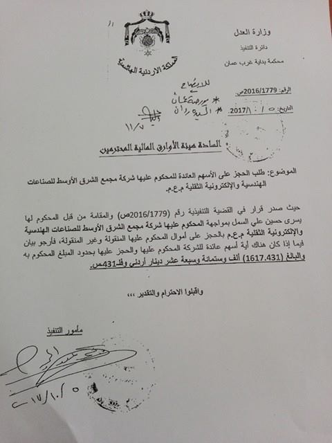 القضية رقم 1779/2016 المحكوم عليها شركة مجمع الشرق الأوسط للصناعات الهندسية والإلكترونية الثقيلة، والمحكوم لها يسرى حسين علي السمل، وتبلغ قيمة المبلغ المحكوم به والمطلوب الحجز عليه 1617.431 دينار أردني.