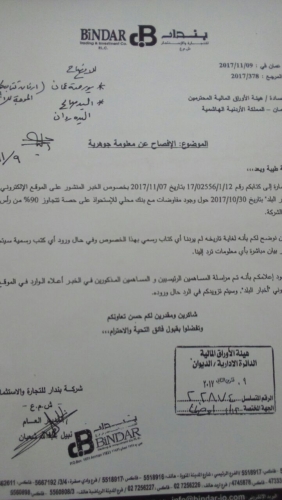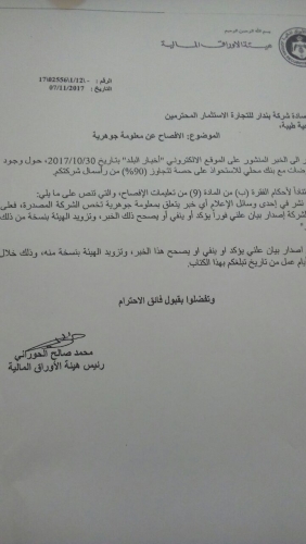 وبناء على ما تم نشره،فقد سارعت هيئة الأوراق المالية بإرسال كتاب بتاريخ